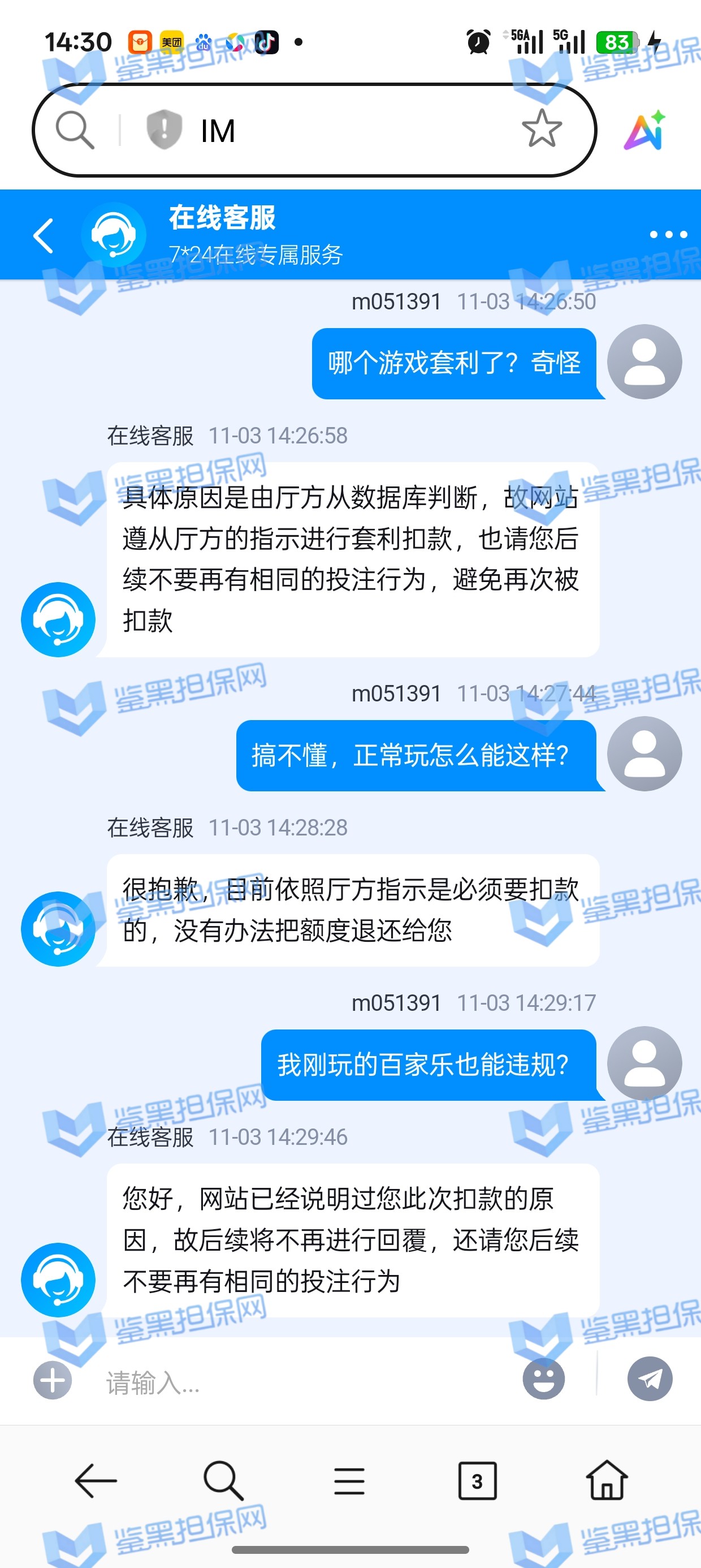 2、鉴黑担保网维权专员联系该平台相关负责人核实情况,对方表示该会员在体育游戏里面存在团伙套利的情况,关联投注等非正常行为,维权专员要求提供相关厅方反馈进行复查,对方拒绝提供,一味的说辞不加以证明,直接扣除本金以及盈利,存在黑款的行为!!