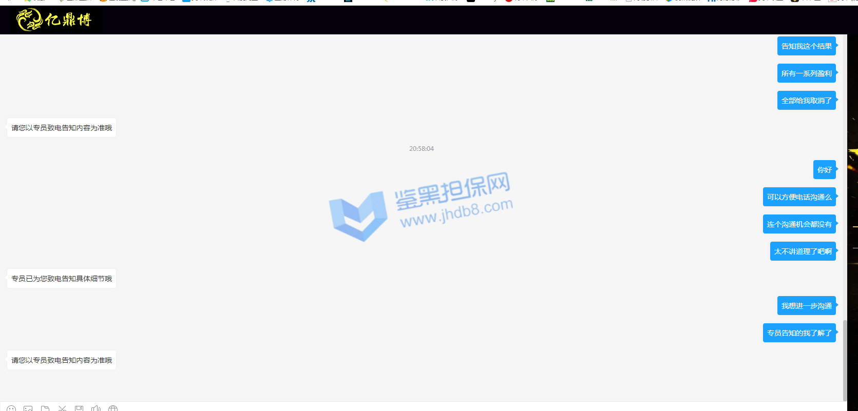 之前逛论坛的时候看到了亿鼎博,然后看优惠政策不错注册了在亿鼎博玩。玩了也快一年了,就在9月10月当天提款155438的时候被取消提款,并直接封禁账户。联系在线客服说稍后电话专员联系,电话专员电话打过来就只通知我账户系统检测出异常导致被封禁, 只退还最后一笔存款本金,让我尽快提款。账号后台直接给我扣款11万。后面我表示了对我账户异常原因表示了询问,电话专员表示他只负责告知这个结果,如果有疑问请与客服联系。后面我与娱乐城在线客服联系,也与微信客服进行联系,都只告诉我以专员致电内容,不告诉我账户异常原因,也不愿意进行和我沟通,就是互相踢皮球。后面我尝试去提款我账户本金8W5,可是依旧显示不能出款,仍需要打3w5流水。本人后面心态爆炸,后面8万5打百家乐3把全打没了。本人对亿鼎博娱乐城有两点最大异议:第一点:账号异常问题,只通知我账号异常,为什么异常,异常原因都不告诉我,只告诉我一个处罚结果,并一直不愿意与本人进行有效沟通,在线客服,微信客服,电话专员互相踢皮球。第二点:本金退还问题,只退还部分本金,本人是存了2笔存款共8万进行游戏后才提款一笔15万5,提过程中又存款一笔3万5,最后只退还提款前的最后一笔存款及提款过程中的那笔存款共8万5。讯问客服,客服说我第一笔存款后是进行游戏输掉的,可是我一直都是盈利的,中间输也就输了几千。 我现在游戏账户被封禁,更多游戏图片拿不出来。对于亿鼎博这种无理由黑钱的平台,大家千万不要去玩,服务态度差,黑钱还理直气壮。