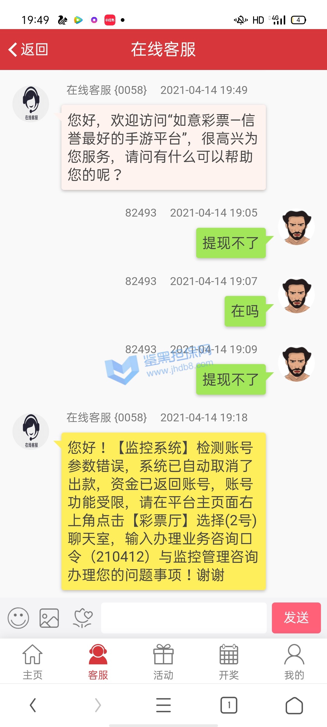 我是个线下低频彩庄家,主营线下福彩3D与体彩排列三的彩民投注,由于个人实力有限,每天会将一部分彩民投注打到盘上,本人保证所有注单都是真实彩民投注! 很早就有这家台子客服的微信,但没有尝试过投注,今年春节前,他家客服联系我,想合作,当时我明确表示低频彩由于玩法杂乱流水低赚钱慢,是一种在网上不受待见的彩种,但对方表示没关系,只要彩票站能买的,他那里都可以投注,于是就拿出了一部分投注到开心100了,也就发生了后面的不愉快! 4月4日晚,我正常投注,开奖后提款,很快就显示提款成功,但直到第二天都没有到账,客服以三方延迟为借口推脱,还诱骗我继续充值,但我没有继续上当,后来经过交涉,客服承认黑我钱,因为我赢了,他要降低损失,一共黑了我73360并注销了我的账号,希望大家擦亮眼睛,不要被这种黑台子诱惑,说的再多保障都没用,真黑你时候,你是找不到人的!另外要说明的是,由于低频彩封盘与投注时间非常紧张,所以本人经过与客服协商并得到他同意后申请了两个账号进行投注,不然忙不过来,每天我投注官方玩法,我员工投注传统彩玩法,绝非同平台对打套利,所有投注项目全部提前与客服协商过并得到了他的同意!恳请平台帮忙维权!